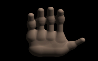 Much better! The negative strength of the spherical components counteracts approximately half of the field strength at the points where to components overlap, so the ugly, unrealistic (and painful looking) bulging is cut out making our hand considerably improved. While we could probably make a yet more realistic hand with a couple dozen additional components, what we get this time is a considerable improvement. Any by now, we have enough basic knowledge of blob mechanics to make a wide array of smooth, flowing organic shapes!