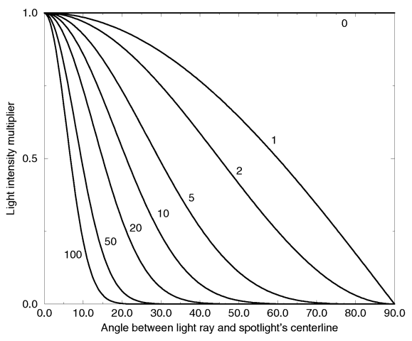 Intensity multiplier curve with fixed angle and falloff angles of 30 and 60 degrees respectively and different tightness values.